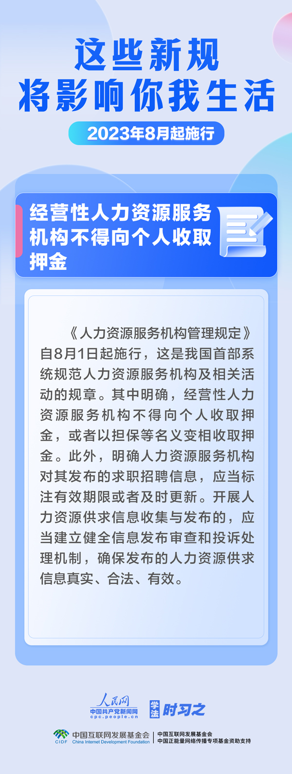 促进生成式人工智能健康发展;扩大适用个税优惠政策的商业健康保险产品范围;明确经营性人力资源服务机构不得向个人收取押金……8月,这些新规施行,将影响你我生活。