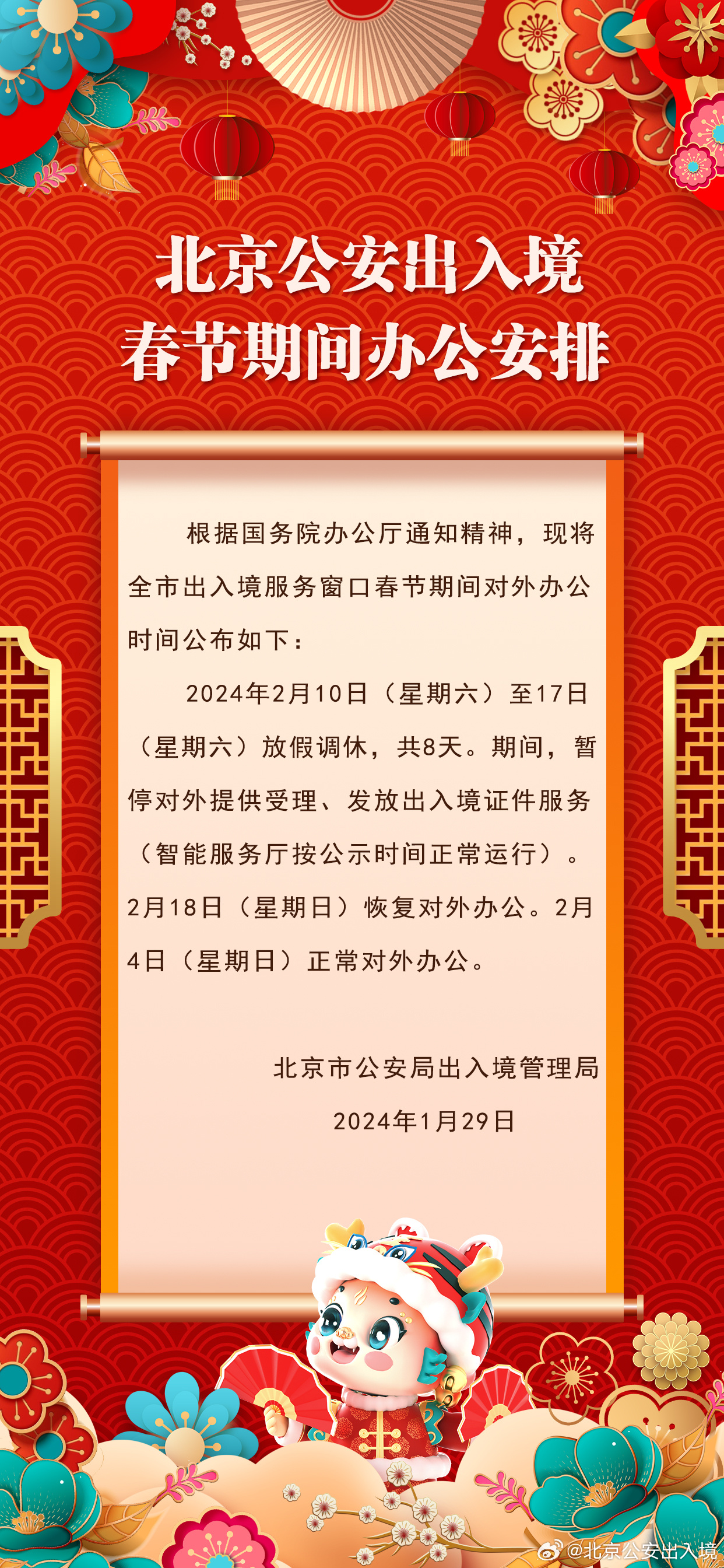 中新网1月29日电 据北京市公安局出入境管理局官方微博消息,北京市公安局出入境管理局发布春节期间办公安排:北京市出入境服务窗口2月10日至17日(大年初一至初八)放假调休,共8天。期间,暂停对外提供受理、发放出入境证件服务(智能服务厅按公示时间正常运行)。2月18日(星期日)恢复对外办公。2月4日(星期日)正常对外办公。