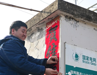 • 1月28日,国网宝鸡供电公司输电运检中心秦岭输电运维班成员赵鹤在变电站张贴新春对联。陕西省宝鸡市凤县的秦岭深处坐落着一座特殊的“融冰”电站——110千伏秦岭融冰变电站。由于当地处在冷暖气流交汇带,雨雪天气极易导致输电线路覆冰。