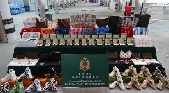 10月8日,香港海关公布,日前与内地及澳门特区海关采取执法行动,打击跨境转运冒牌货物活动。图为香港海关检获的部分怀疑冒牌货物。 (香港海关供图)