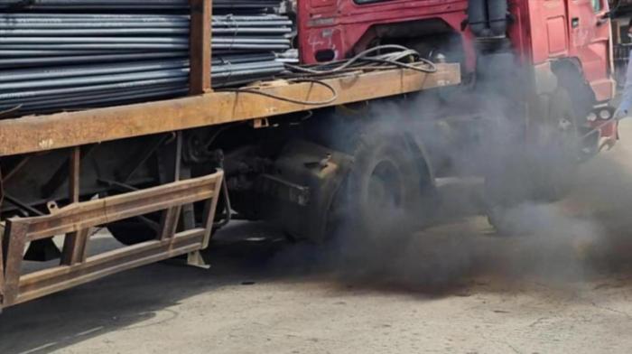 2024年5月19日,督察组现场督察发现,上海市宝山区佰隆码头使用报废柴油货车进行内部运输,排气口黑烟滚滚。图源:生态环境部