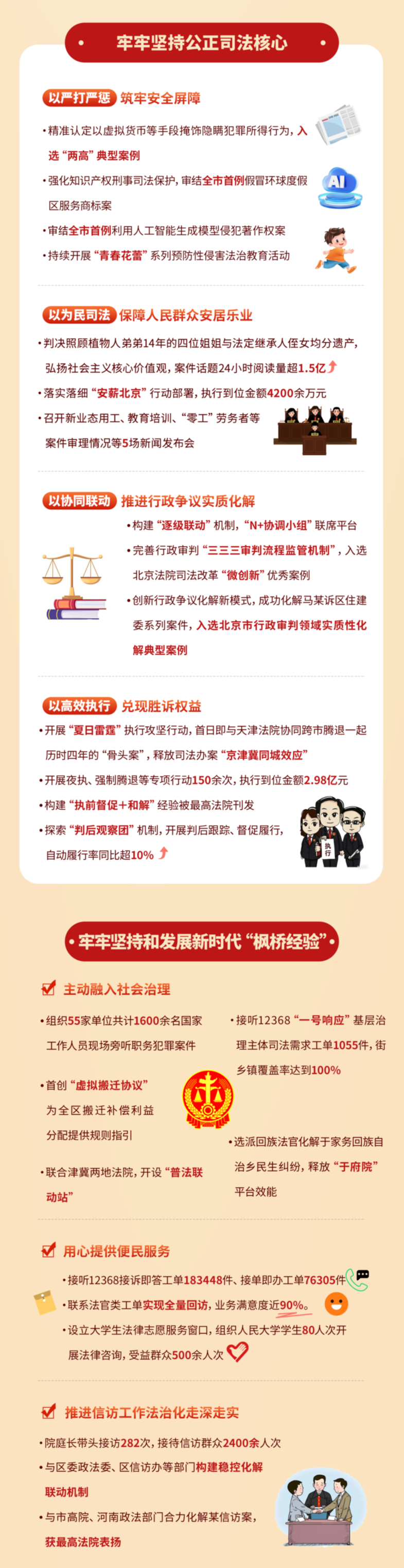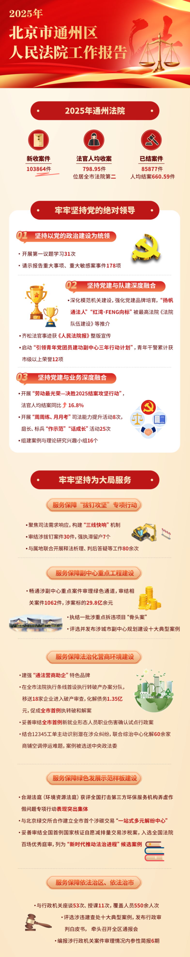 报告中,谭劲松院长围绕“牢牢坚持党的绝对领导,以党建引领‘两个融合’巩固模范机关建设成效”“牢牢坚持为大局服务,以高度政治责任感全力支撑和服务副中心高质量发展”“牢牢坚持公正司法核心,以审执质效全面提升筑牢司法公信力根基”“牢牢坚持和发展新时代‘枫桥经验’,助力构建矛盾纠纷预防化解新格局”“牢牢坚持全面从严治党,以梯队建设锻造高素质过硬法院队伍”五个方面,全面回顾了通州法院2025年的工作情况。