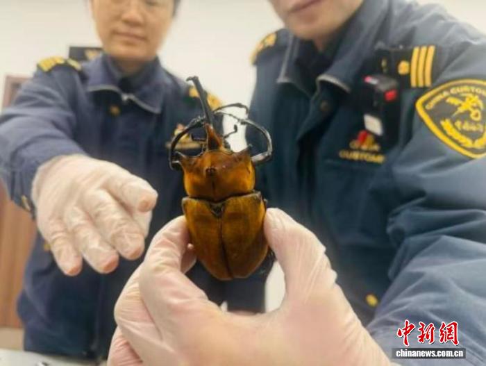 日前,金陵海关关员在进境邮件中查获毛象大兜虫。 刘诗月摄
