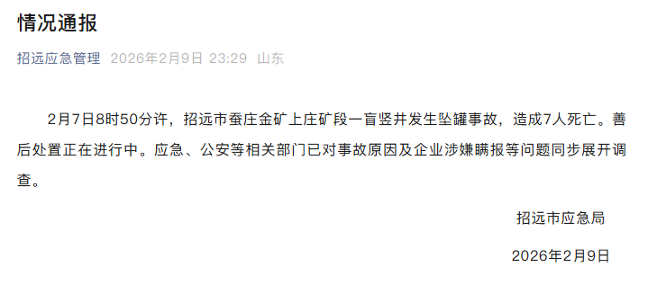 2月7日8时50分许,招远市蚕庄金矿上庄矿段一盲竖井发生坠罐事故,造成7人死亡。善后处置正在进行中。应急、公安等相关部门已对事故原因及企业涉嫌瞒报等问题同步展开调查。