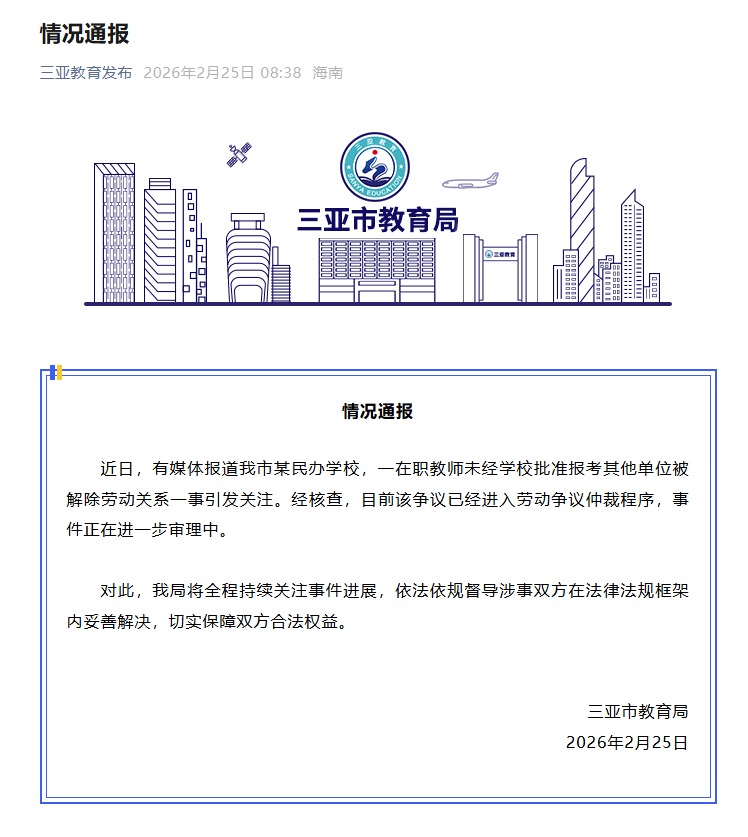 中新网2月25日电 据“三亚教育发布”微信公众号消息,2月25日,三亚市教育局发布情况通报称,近日,有媒体报道三亚市某民办学校,一在职教师未经学校批准报考其他单位被解除劳动关系一事引发关注。经核查,目前该争议已经进入劳动争议仲裁程序,事件正在进一步审理中。