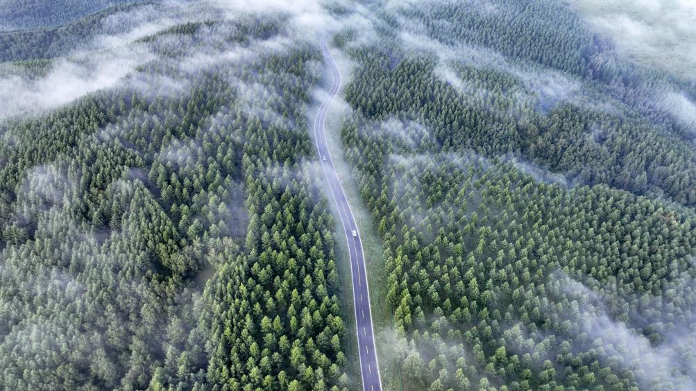 2024年7月26日拍摄的塞罕坝国家级自然保护区景色(无人机照片)。夏日清晨,位于河北省承德市的塞罕坝国家级自然保护区满目青翠,浩瀚林海壮美如画。新华社发(王立群摄)