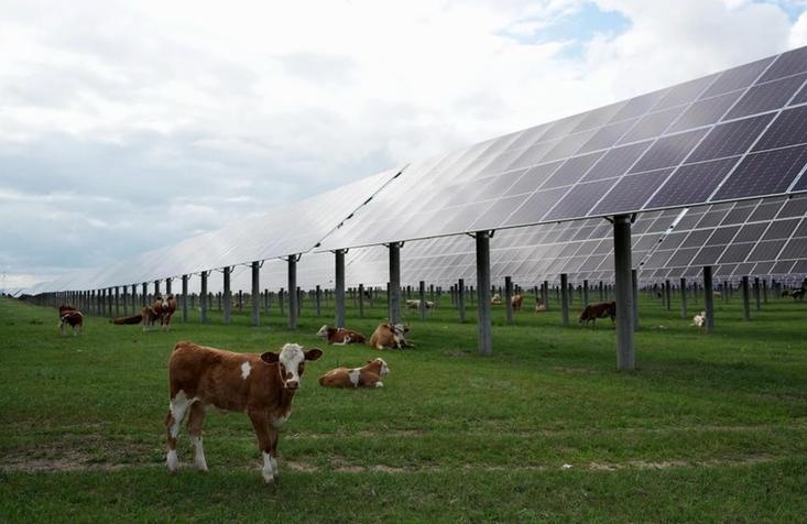 牛群在河北省围场满族蒙古族自治县御道口镇附近的一处“牧光互补”光伏发电场吃草(2024年7月25日摄)。新华社记者 杨世尧摄