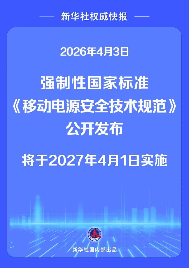 2026年4月3日,强制性国家标准《移动电源安全技术规范》公开发布,将于2027年4月1日实施。新标准提出多项要求,进一步强化包括充电宝在内的移动电源产品安全水平——