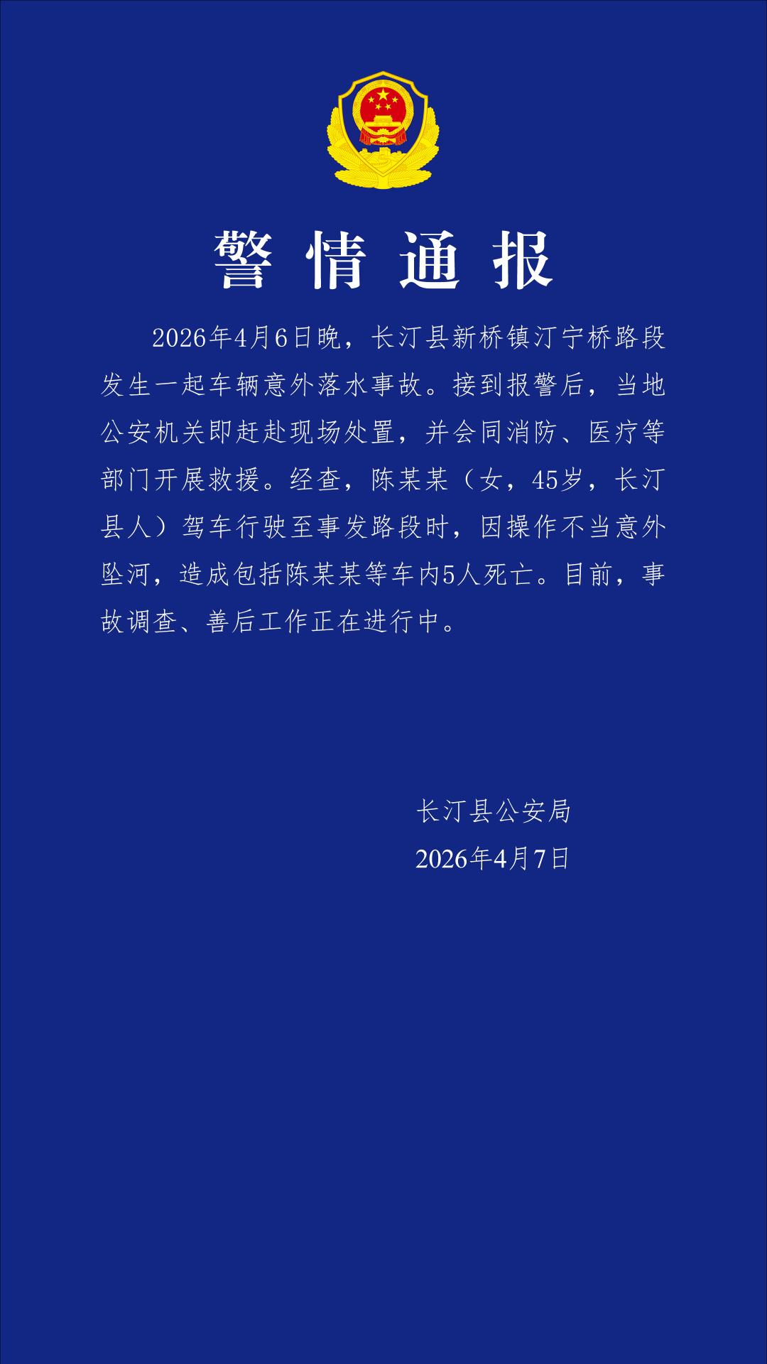 2026年4月6日晚,长汀县新桥镇汀宁桥路段发生一起车辆意外落水事故。接到报警后,当地公安机关即赶赴现场处置,并会同消防、医疗等部门开展救援。经查,陈某某(女,45岁,长汀县人)驾车行驶至事发路段时,因操作不当意外坠河,造成包括陈某某等车内5人死亡。目前,事故调查、善后工作正在进行中。