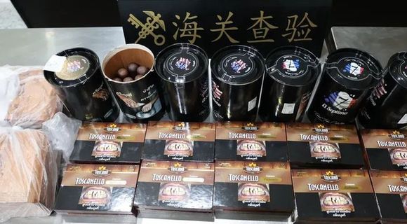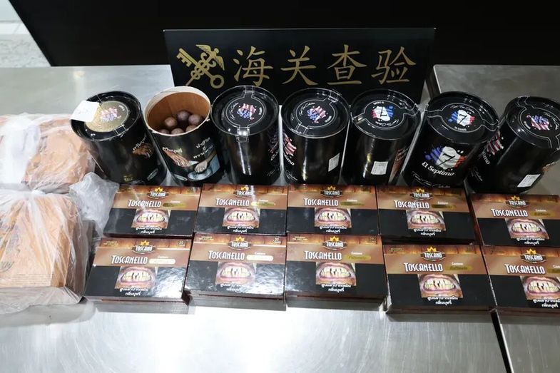 海关关员查获的328支雪茄。图片来源:“海关发布”微信公众号