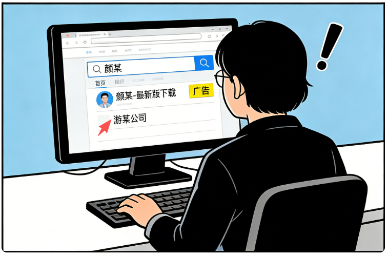 数某公司偶然发现,用户在某大型搜索引擎搜索“颜某”时,首页赫然出现带有“广告”标识的“颜某-最新版下载”链接,下方却标注着游某公司平台名称,点击后直接跳转至APP下载页面。