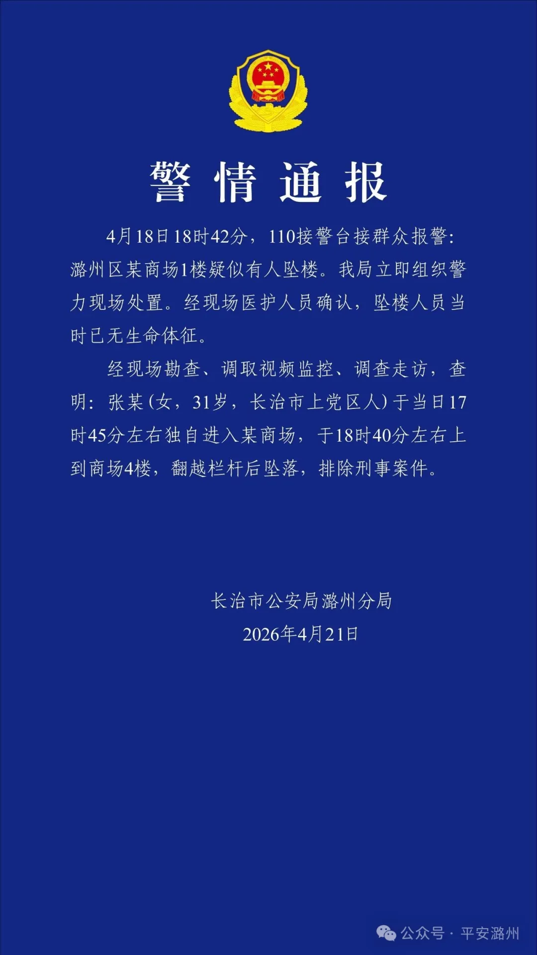 经现场勘查、调取视频监控、调查走访,查明:张某(女,31岁,长治市上党区人)于当日17时45分左右独自进入某商场,于18时40分左右上到商场4楼,翻越栏杆后坠落,排除刑事案件。