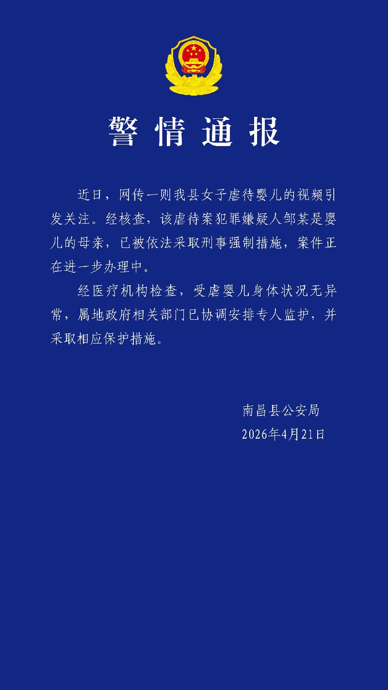 央视网消息:据南昌县公安局微信公众号消息,近日,网传一则南昌县女子虐待婴儿的视频引发关注。经核查,该虐待案犯罪嫌疑人邹某是婴儿的母亲,已被依法采取刑事强制措施,案件正在进一步办理中。