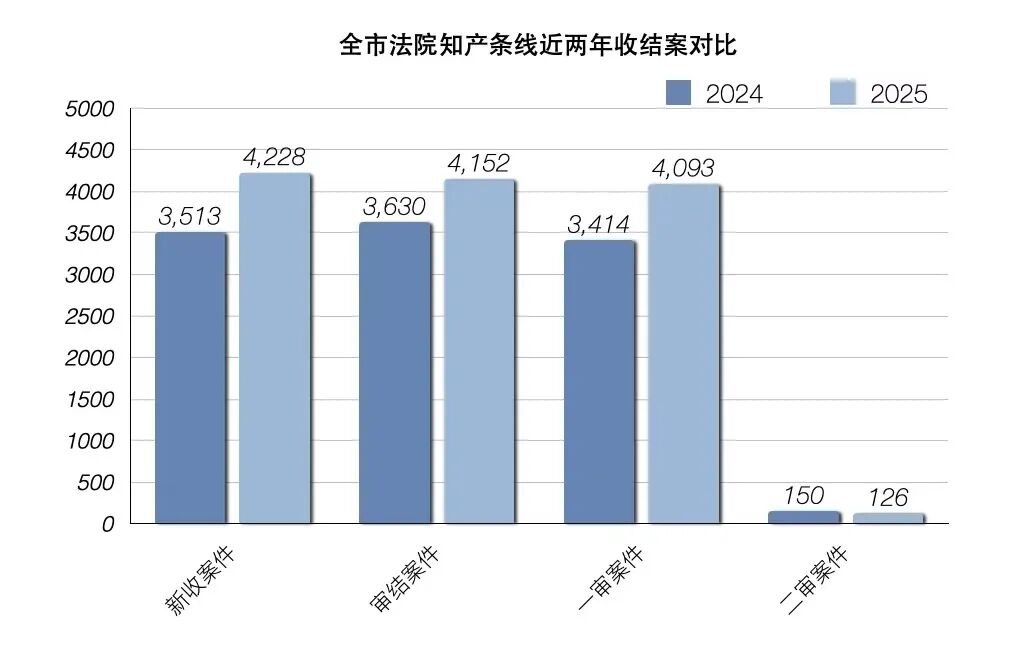 2025年,全市新收各类知产民事、刑事、行政案件4228件,审结4152件(含旧存),同比分别上升20.35%、14.38%。