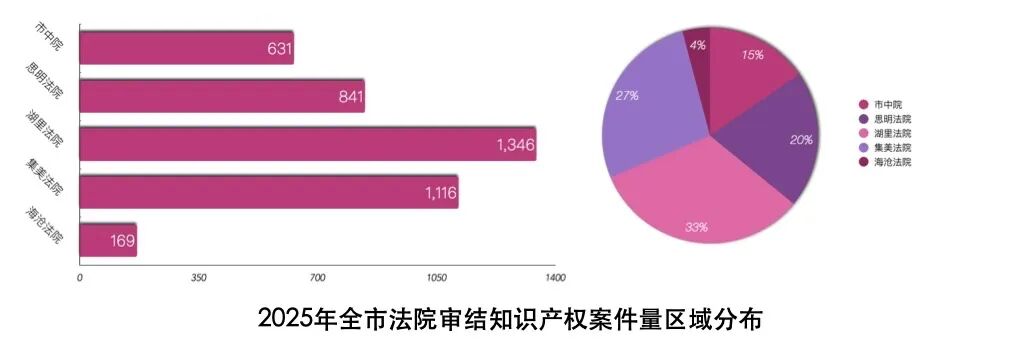 2025年度,厦门两级法院知产案件审结量区域分布如下: